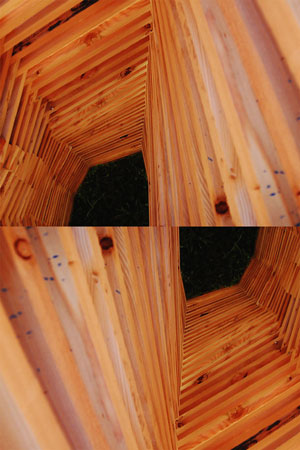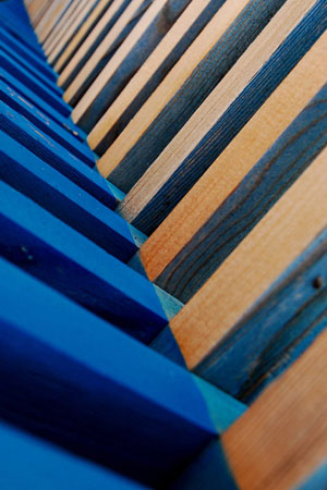 Inneres BlauFotoarbeiten auf AludibondDie Werkgruppe Inneres Blau steht in direktem Zusammenhang mit dem blauen Kreis, geht aus diesem hervor und beleuchtet ihn auf geheimnisvolle Weise. Diese Serie beschäftigt sich mit Details aus der umfangreichen Installationsreihe, verharrt jedoch nicht in der Abbildung, sondern eröffnet durch die Art und Weise der Gliederung, Komposition und Reduzierung auf Licht und Struktur, einen eigenständigen Bild-Kosmos. Tiefe Raumfluchten, dynamisierte Holzsignaturen, diagonale Durchdringungen und Verzahnungen prägen diesen Bildzyklus, der in seiner Reduktion die Eigentümlichkeit und Farbqualitäten der Installationsarbeiten neu inszeniert. | |||||||||||||||||||||||||||||||||||||